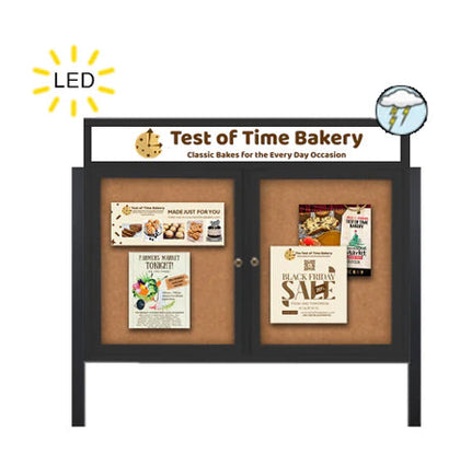 - Outdoor bulletin boards with a message header and lights offer the most possibilities for personalization. Use a title to publicize your business name or brand or to promote a new product. We can print your header text in standard uppercase Helvetica black font for no extra charge. Or have your logo printed using unique fonts and colors. Combine a custom header with LED lighting to produce a stunning display.