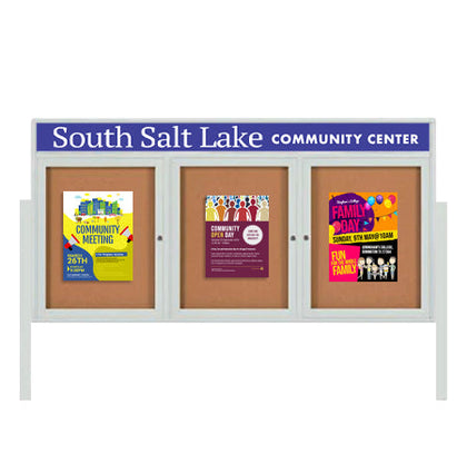 Outdoor Enclosed 84x36 Cork Bulletin Boards w Personalized HEADER (Radius Edge & Leg Posts) 3 DOORS