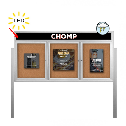 Outdoor Enclosed 96x30 Bulletin Cork Boards with ILLUMINATED HEADER (with Radius Edge & Leg Posts) (3 DOORS)
