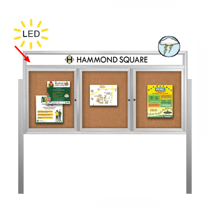 Outdoor Enclosed 96x48 Bulletin Cork Boards with ILLUMINATED HEADER (with Radius Edge & Leg Posts) (3 DOORS)
