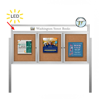 Outdoor Enclosed 72x30 Bulletin Cork Boards with ILLUMINATED HEADER (with Radius Edge & Leg Posts) (3 DOORS)