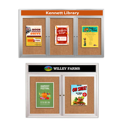 2-3 Door Enclosed Outdoor Bulletin Boards with Your Message Header and Radius Edge Cabinet Corners | All-Weather, Wall Mount Aluminum Display Case 35+ Sizes