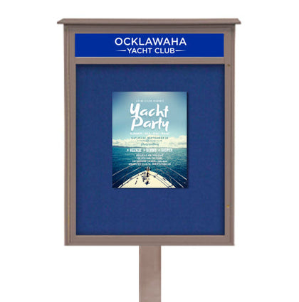 Eco-Design, Faux Wood 18 x 24 Outdoor Message Center Cork Board on Posts with Single Door Cabinet and Your Custom Printed Header