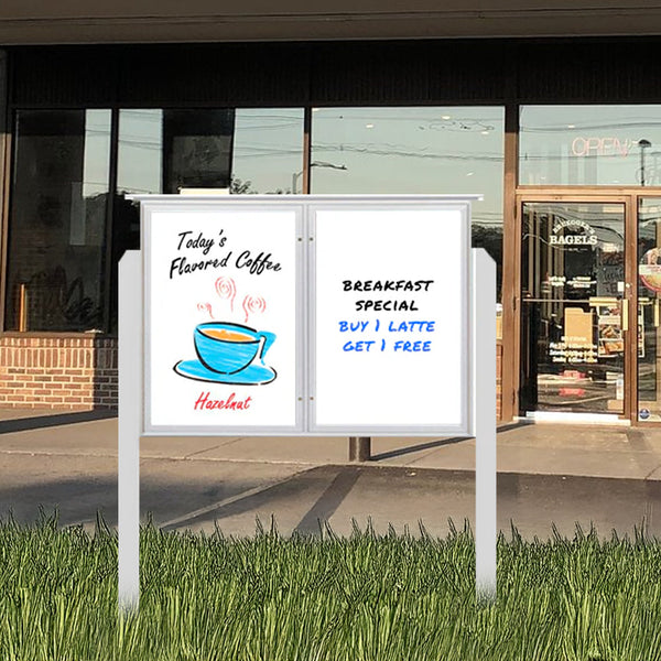 White Boards aren't just for indoor use, because we've taken it outdoors. Our 2-door, free standing 45 x 30 Viewable Area Outdoor Message Center Magnetic White Dry Erase Board with Posts has durable porcelain on a steel writing surface. So, not only can you create engaging, eye-catching hand-written messages and drawings, you can post various printed messages, bulletins, signage, and graphics onto the markerboard with simple magnets.